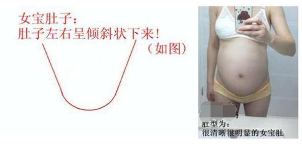 宝妈们在判断自己的肚型的时候,可以用相机把肚型拍下来再进行判断,需要注意的是,肚子的底缘要露的多些,拍肚子照的角度—定要是正平面。据说只要是女宝的肚子,肚肚下端均呈倒置的梯形状,线条比较突出可谓有棱有角,梯形越明显的准确率越高。