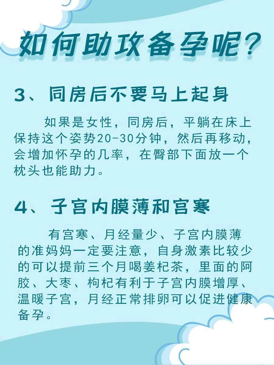 如果是女性,同房后,平躺在床上保持这个姿势20-30分钟,然后再移动,会增加怀孕的几率,在臀部下面放一个枕头也能助力。