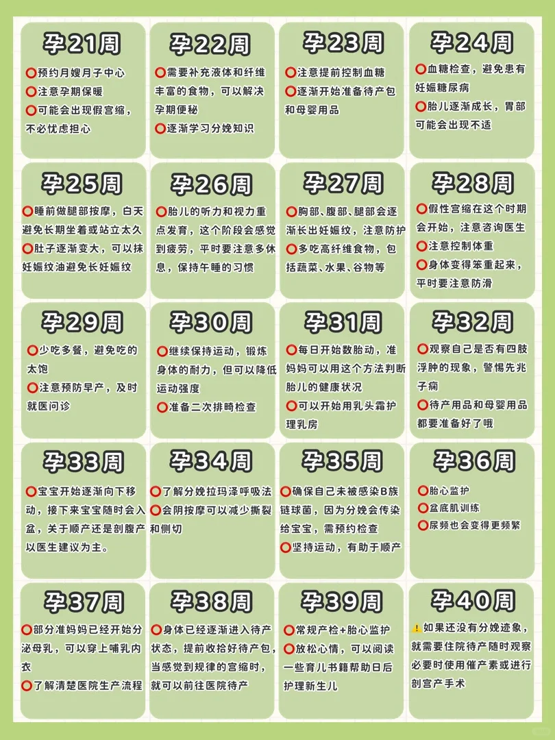 孕期准妈妈的每一周都很关键,每一周需要做什么也可以根据图上的来安排自己每天的行程和营养。